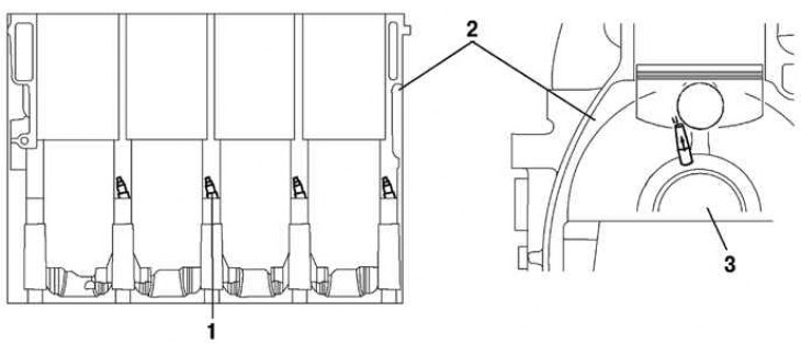 Рис. 2.46. Место устанвки клапанов маслоразбрызгивающих сопел: 1 – клапан маслоразбрызгивающего сопла; 2 – блок цилиндров; 3 – коленчатый вал