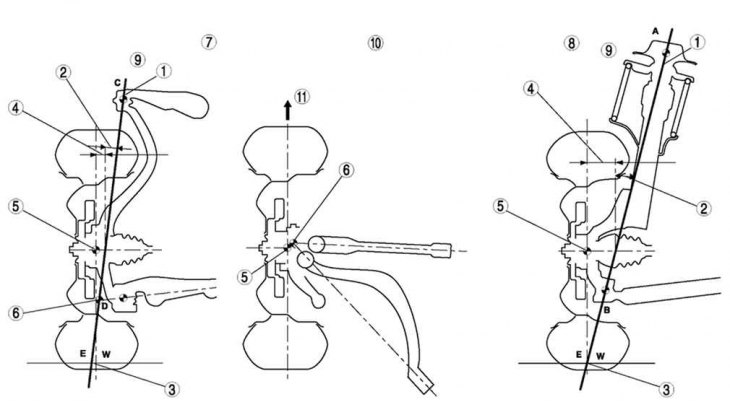 Рис. 4.3. Сравнительная схема подвесок – со стойкой и поперечными рычагами: 1 – ось шкворня; 2 – наклон шкворня; 3 – смещение шкворня; 4 – смещение шкворня относительно центра колеса; 5 – центр колеса; 6 – мнимая точка поворота; 7 – передняя подвеска с двумя поперечными рычагами высокого крепления; 8 – передняя подвеска со стойкой (626); 9 – вид спереди; 10 – вид сверху; 11 – передняя часть