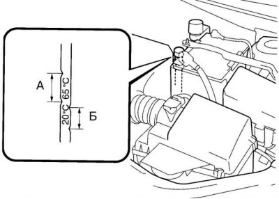 Если двигатель не работал и температура окружающего воздуха составляет около 20°C, то уровень рабочей жидкости должен находиться между верхней и нижней метками на правой стороне щупа.