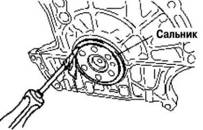 Отстранете уплътнението на маслото с помощта на плоска отвертка, увита в парцал, за да предотвратите повреда на уплътнението на коляновия вал (фиг. 2,279).
