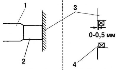 Фиг. 2.111. Схема за пресоване на предния семеринг: 1 – чук; 2 – специално устройство; 3 – преден капак на двигателя; 4 – преден семеринг