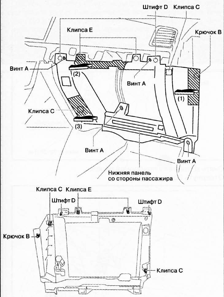 4. Trzymając za zacienione miejsca na rysunku i pociągając panel dolny po stronie pasażera w kierunku strzałek w kolejności (1), (2), (3) zdemontować go odłączając hak B, zaciski C, kołki D i klipsy E.