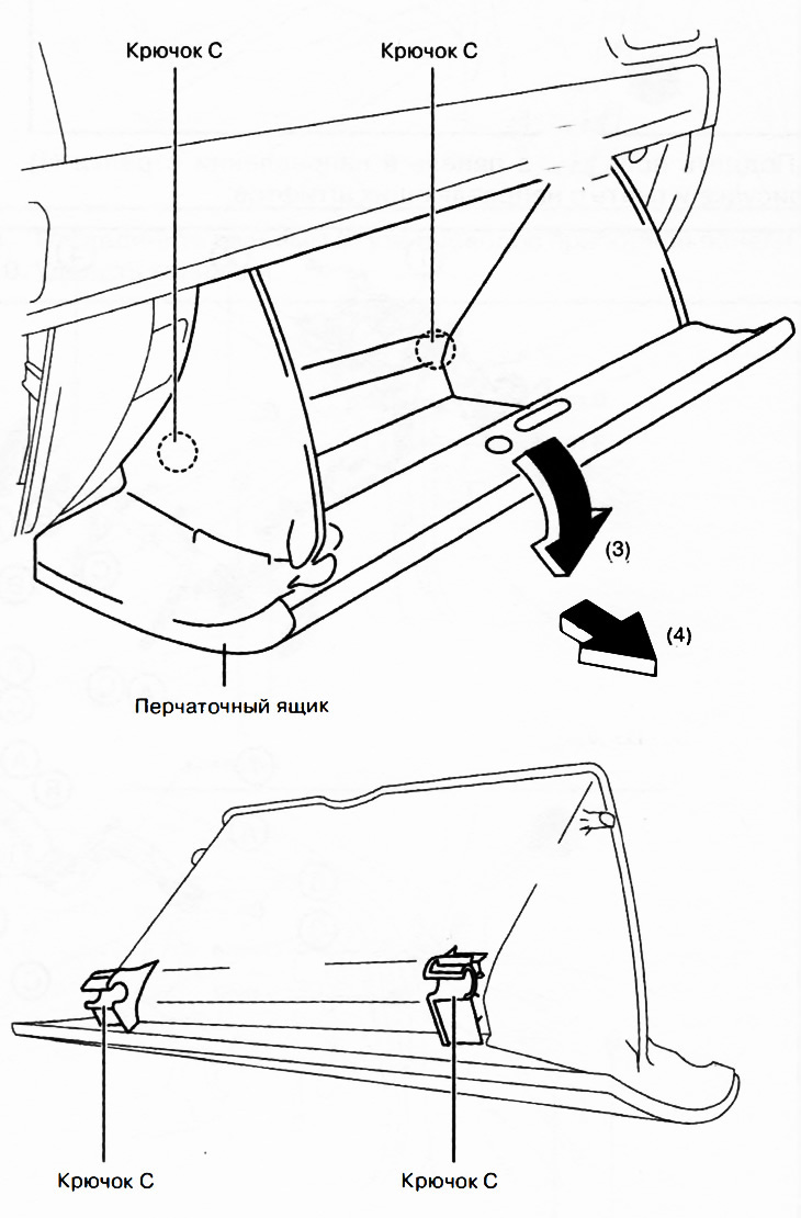 4. Pociągnij schowek w kierunku strzałki (4) i wyjmij go odłączając haczyki C.