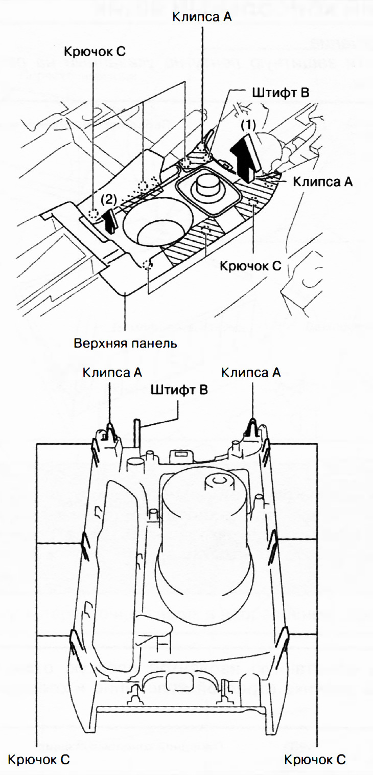 5. Chwytając za zacienione miejsca na rysunku zdejmij panel górny w kierunku strzałek w kolejności (1), (2), rozłączając zaciski A, sworzeń B i haki C.