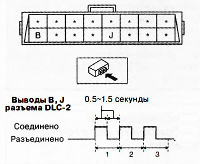 4. Помоћу краткоспојника три пута повежите терминале Б и Ј (уземљење) дијагностичког конектора DLC-2 у интервалима од 0,5-1,5 секунди, као што је приказано на слици.
