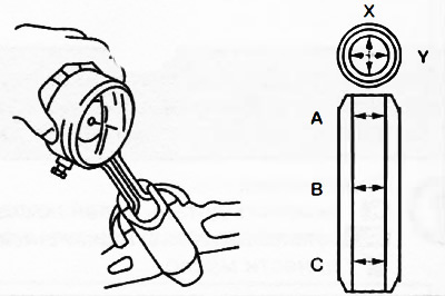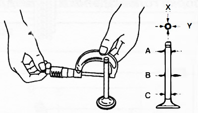 3. Помоћу микрометра измерити пречник вретена вентила у шест положаја у два међусобно окомита правца (Кс и И) у три тачке дуж дужине вретена (А, Б и Ц), као што је приказано на слици. Ако измерене вредности нису тачне, замените вентил новим.